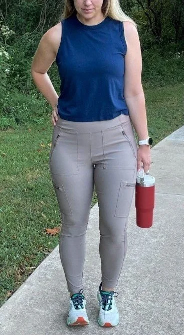 When hiking, my go to attire is a sports bra, sweat-wicking shirt, lightweight jacket, stretchy shorts or pants, and a pair of trail runners or hiking boots (depending on the terrain).