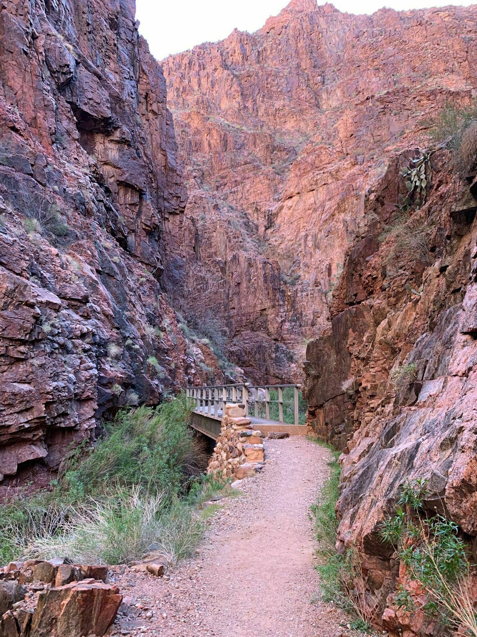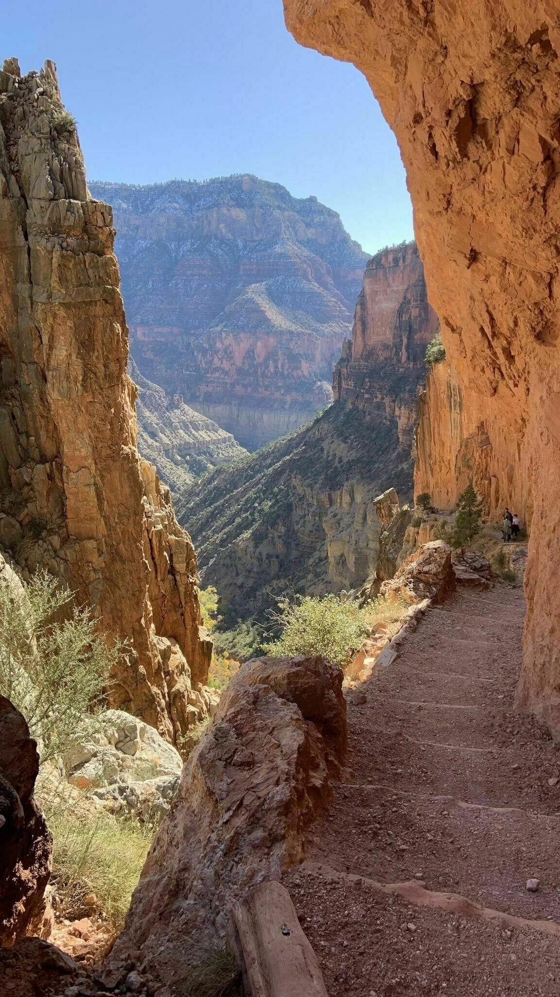 Next, tight switchbacks continue to the 3.4 mile marker where the you will see the infamously pictured Redwall Footbridge that crosses the east side of the canyon to the west. Next you will hike alongside a massive, narrow cliff of Redwall Limestone, where for long stretches the trail has been blasted out of the cliff in a half tunnel.